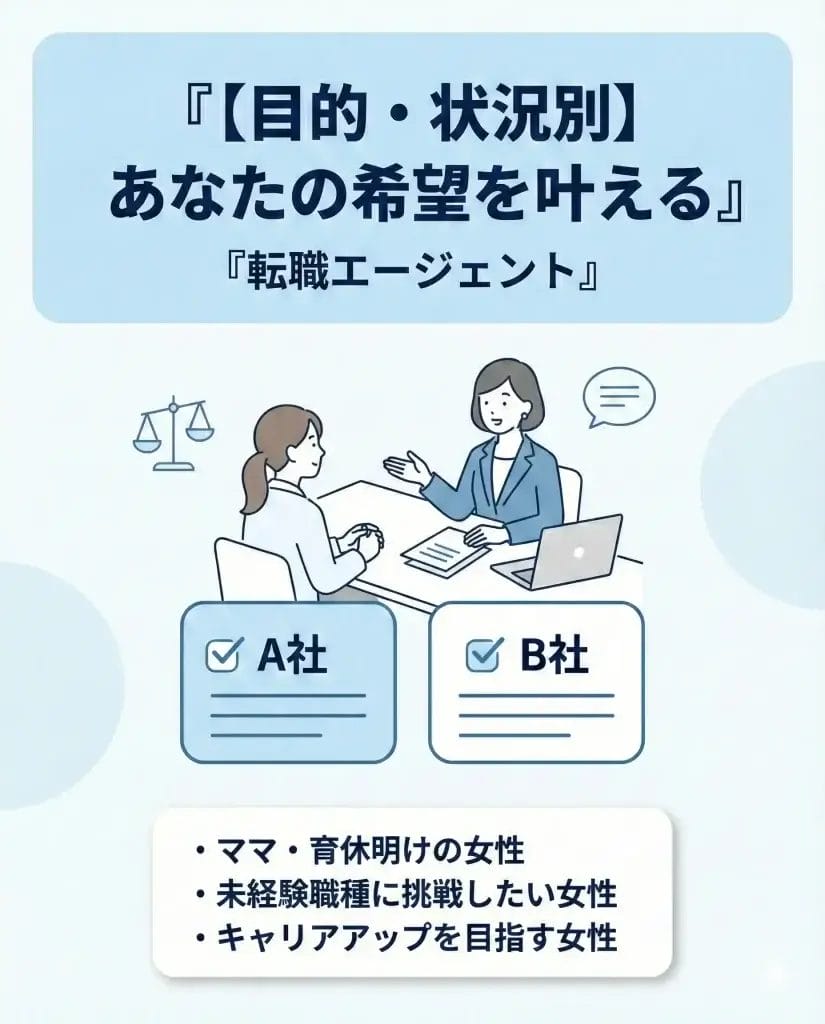目的別に見ると、ママ転職=両立運用の実態、未経験=育成の仕組み、年収UP=ハイクラス/非公開案件と交渉力がキモです。同じ「良い会社」でも、あなたの目的と企業の期待がズレると失敗するので、エージェントの“確認力”が成果を左右します。