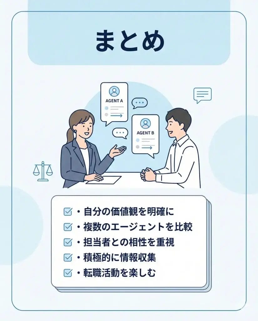 - 担当者との相性を見極められる: 自分に合わない担当者に当たっても、他のエージェントで活動を続けられる。